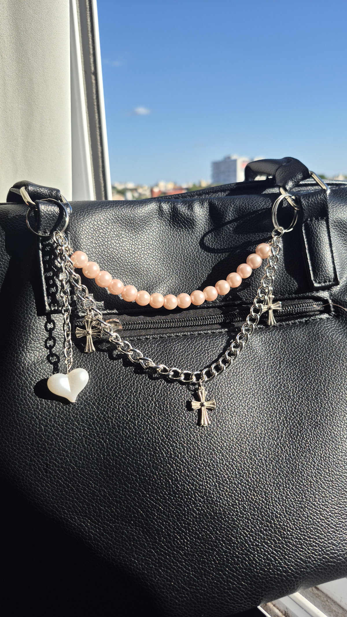 Accesorio para cartera con perlas, cadena de aluminio y dijes de niquel (los dijes se puede elegir/modificar)