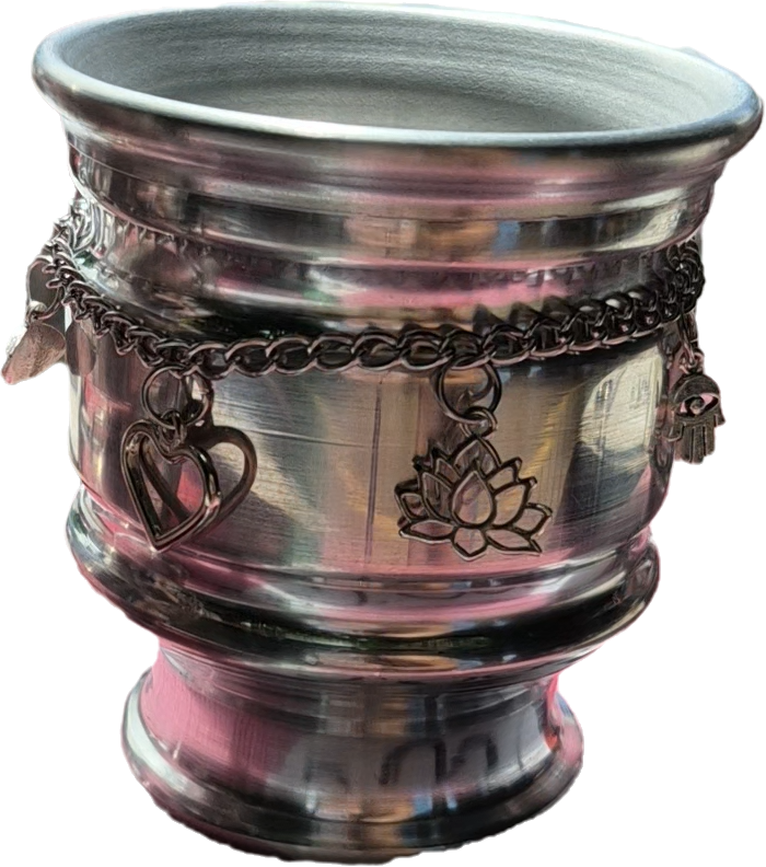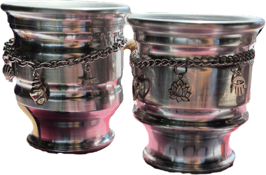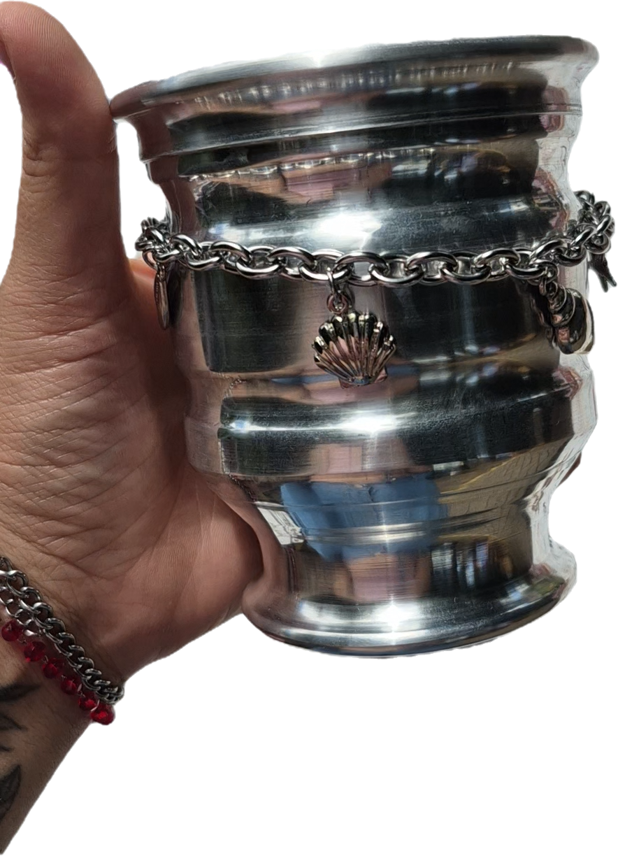 Mate de aluminio con cadena de acero quirúrgico y dijes de niquel, los dijes se pueden elegir.