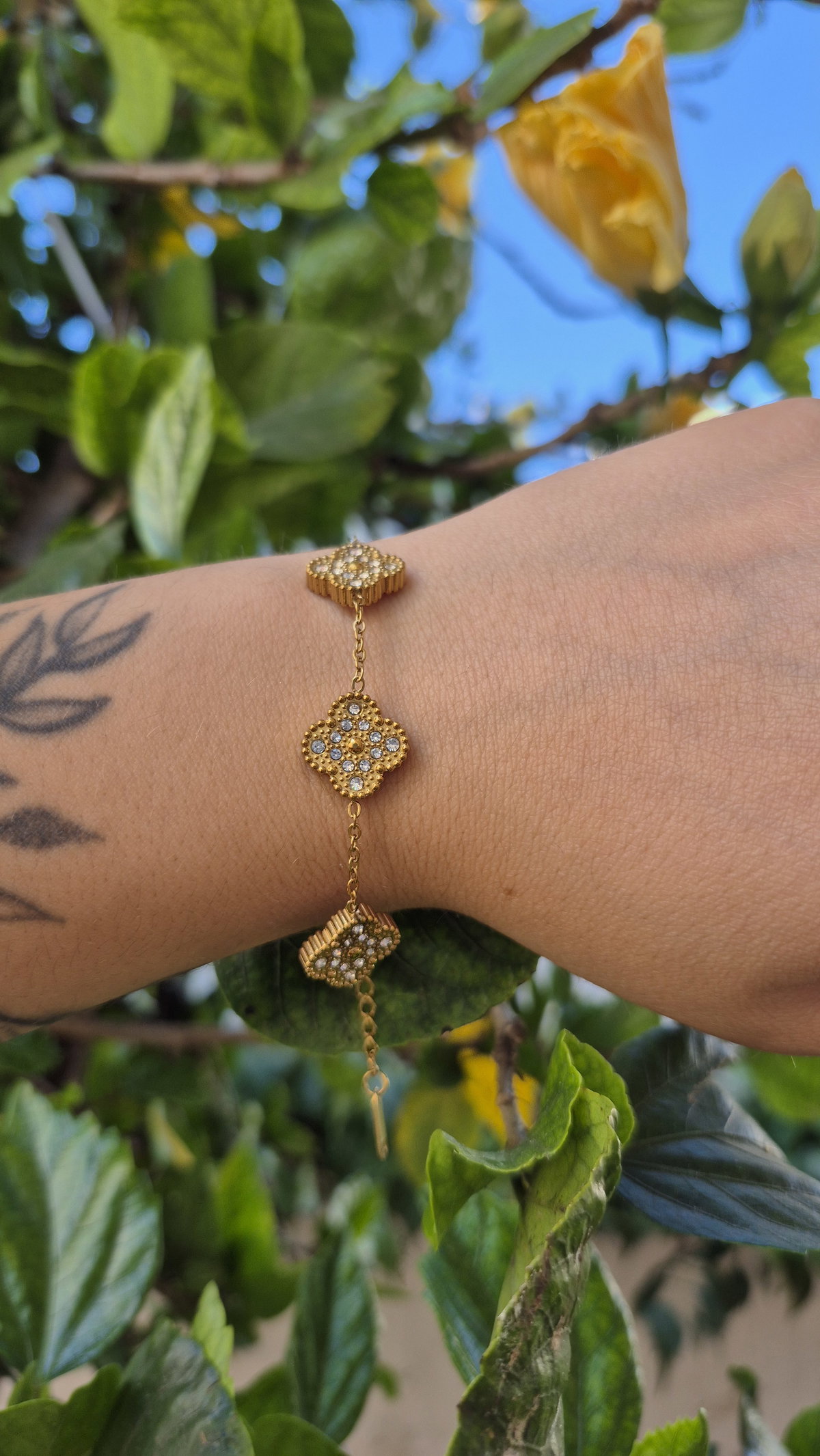 Pulsera dorada con strass treboles