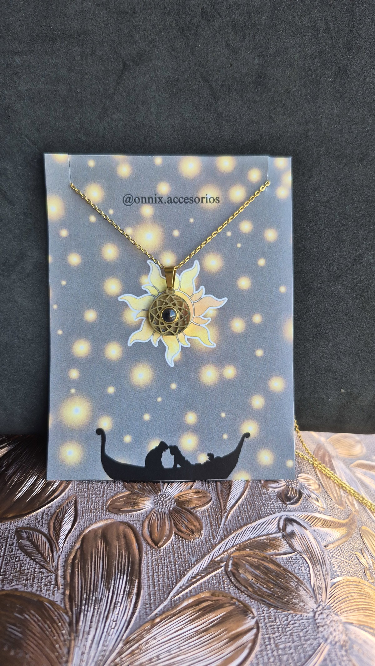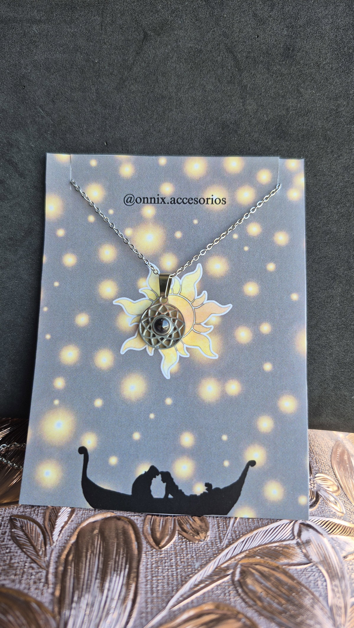 El dije en el centro contiene "te amo" en 100 idiomas.